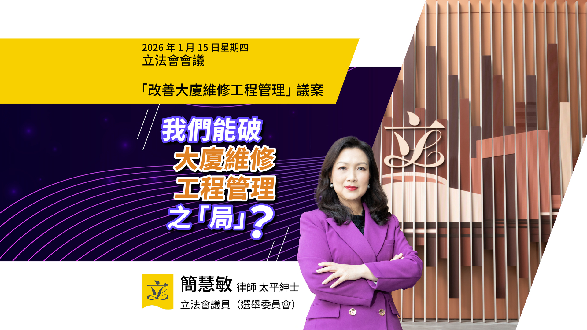 此外,當局建議強化《建築物管理條例》,包括當法團在議決工程或開支項目時,提升親身出席和投票的業主數目門檻,加強對委任代表文書和利益申報的規管,並擴大監管當局的權力。而市區重建局「招標妥」的功能和招標安排標準也會提升。